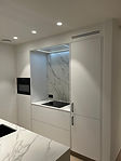 Witte (poederlak) maatkeuken met strakke lijnen, mat zwarte nis en geïntegreerde barkast.