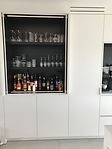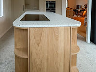 Keuken in eik fineer met ronde elementen. Wandkast in Fenix laminaat